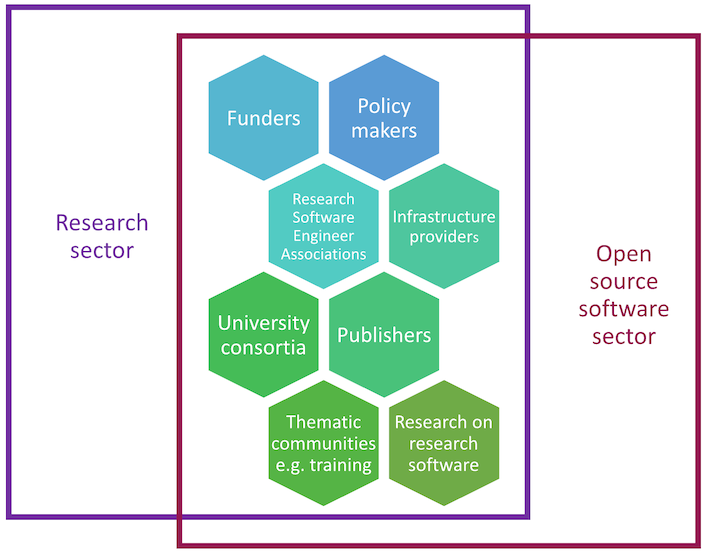 - Policy makers (e.g., government, publishers, infrastructure providers, research organisations): Engaging in the drafting of key international policy documents from UNESCO and OECD, which has led to the inclusion and recognition of research software as a crucial part of open science.